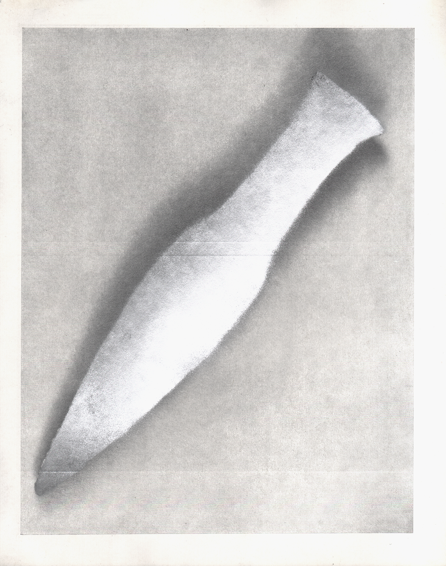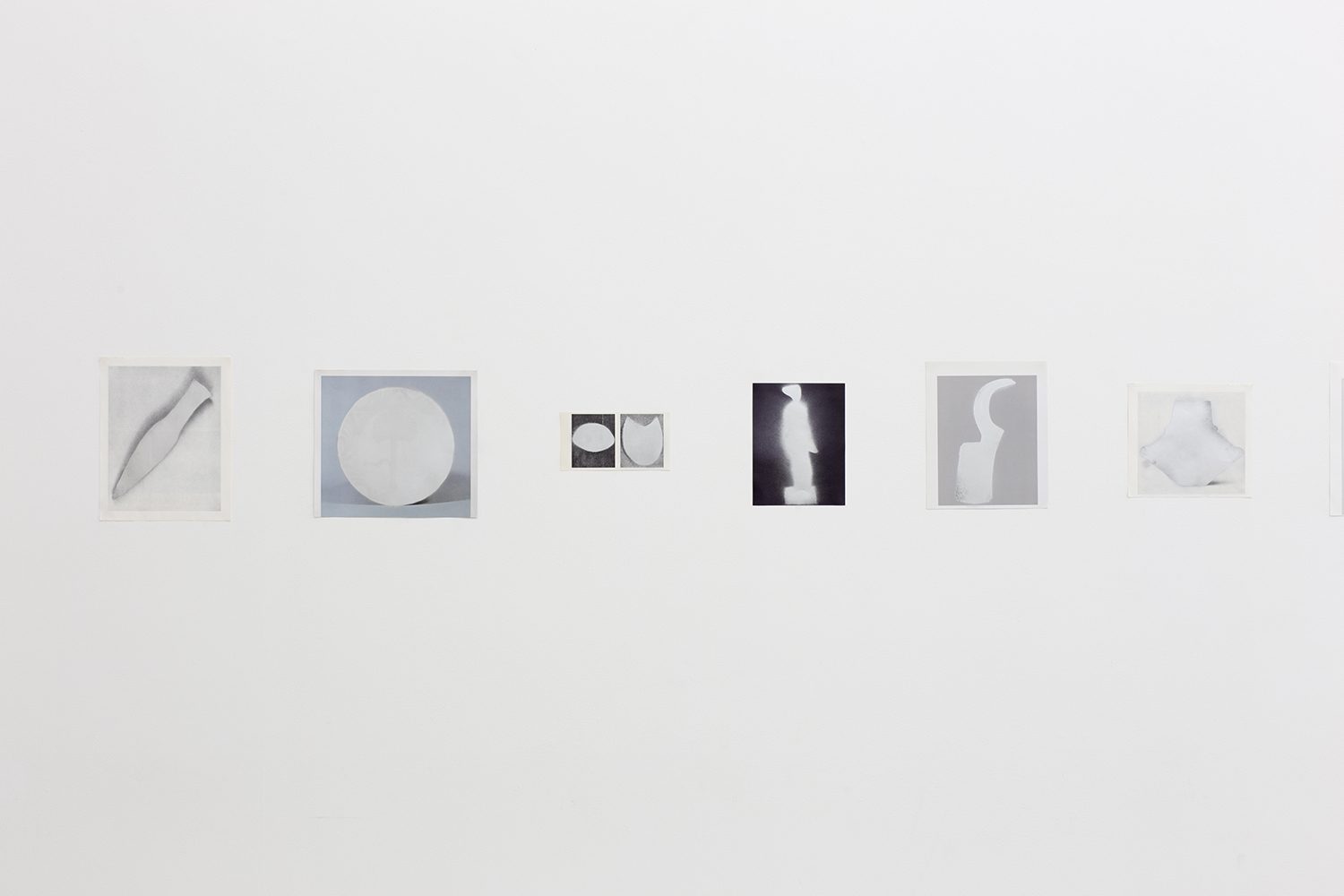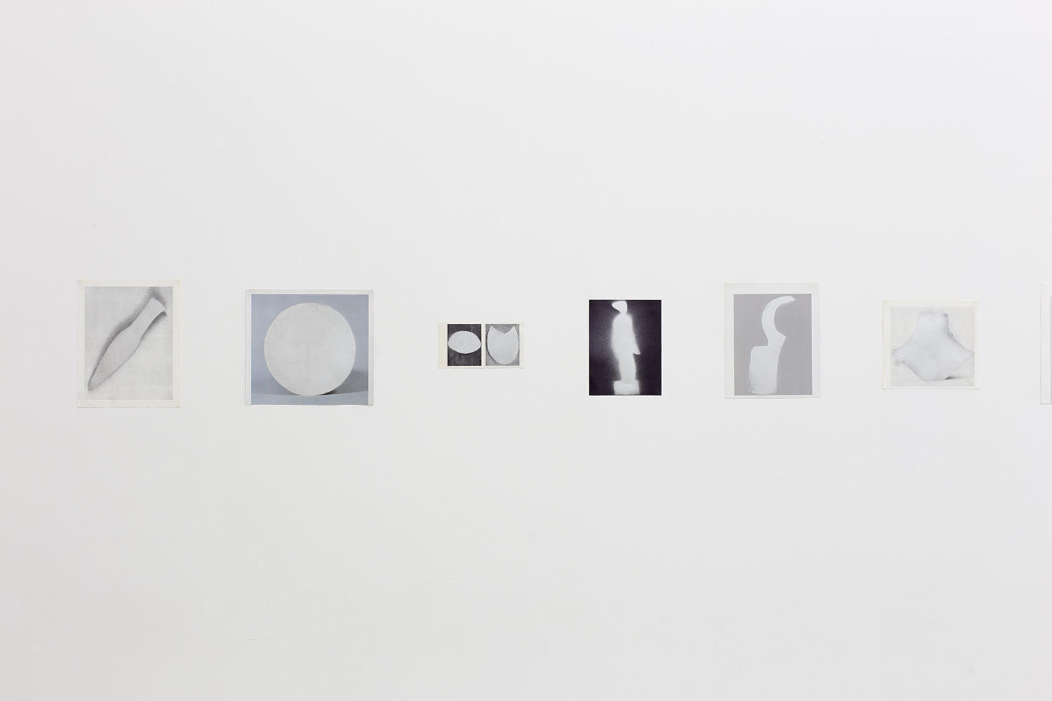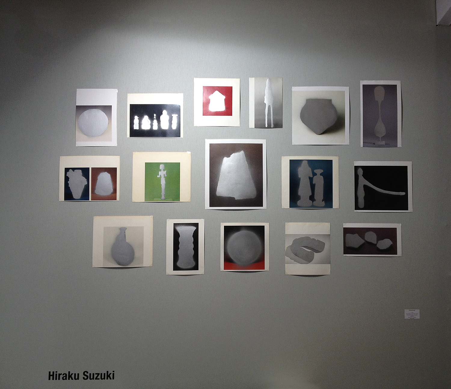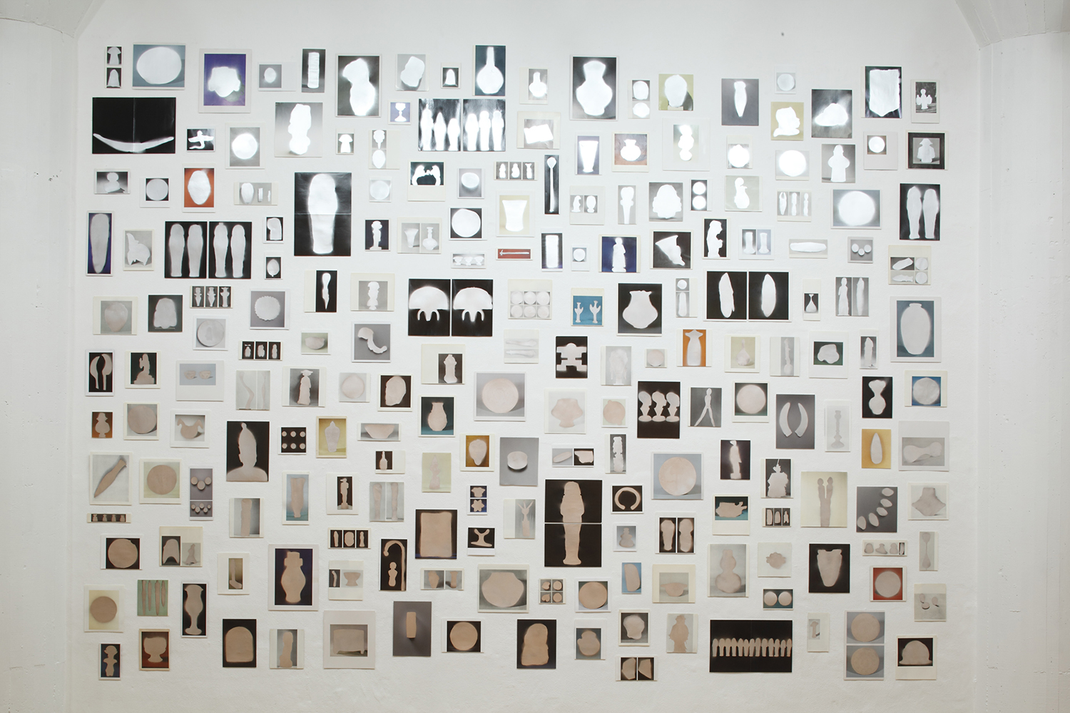 “casting”(2010-) is a series that involves making stencils by cutting around the outlines of artifacts in photographs taken from the pages of museum catalogues acquired from around the world. The artist then uses the stencils with silver spray on the printed page, deleting the memory of each object to leave just an outline and a shadow where once an artifact had been. As a result, the artifact reappears with the look of an unknown object having a silver sheen and seeming to be three-dimensional. The process of bringing into existence a new image by manipulating the traces of something to reverse its shape—taking it from positive to negative and back again—underlies both the process of casting using metal and the processing of developing photographs.