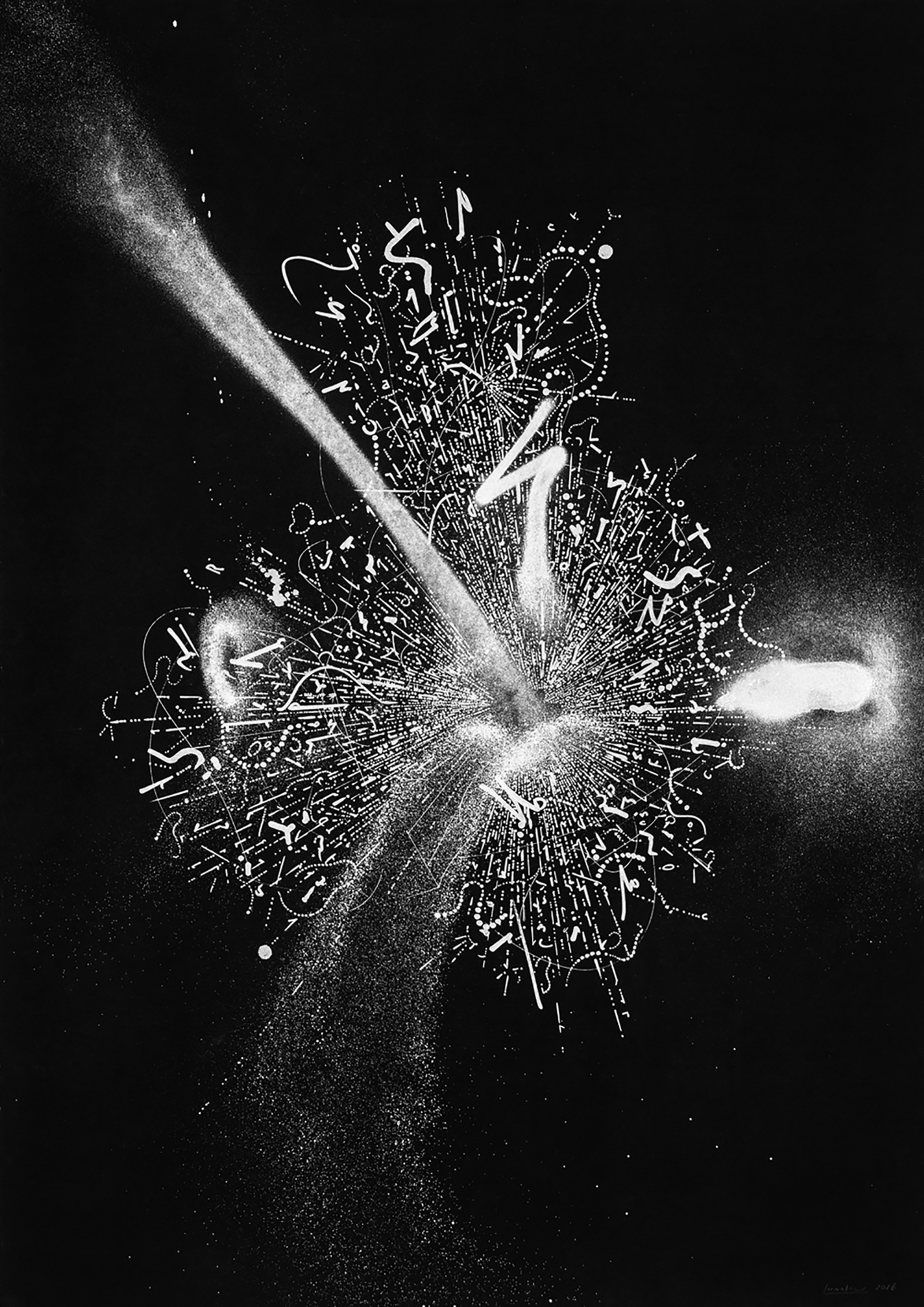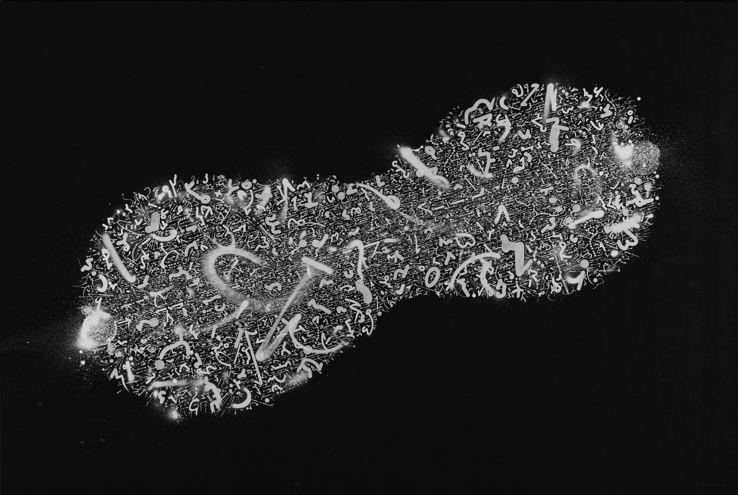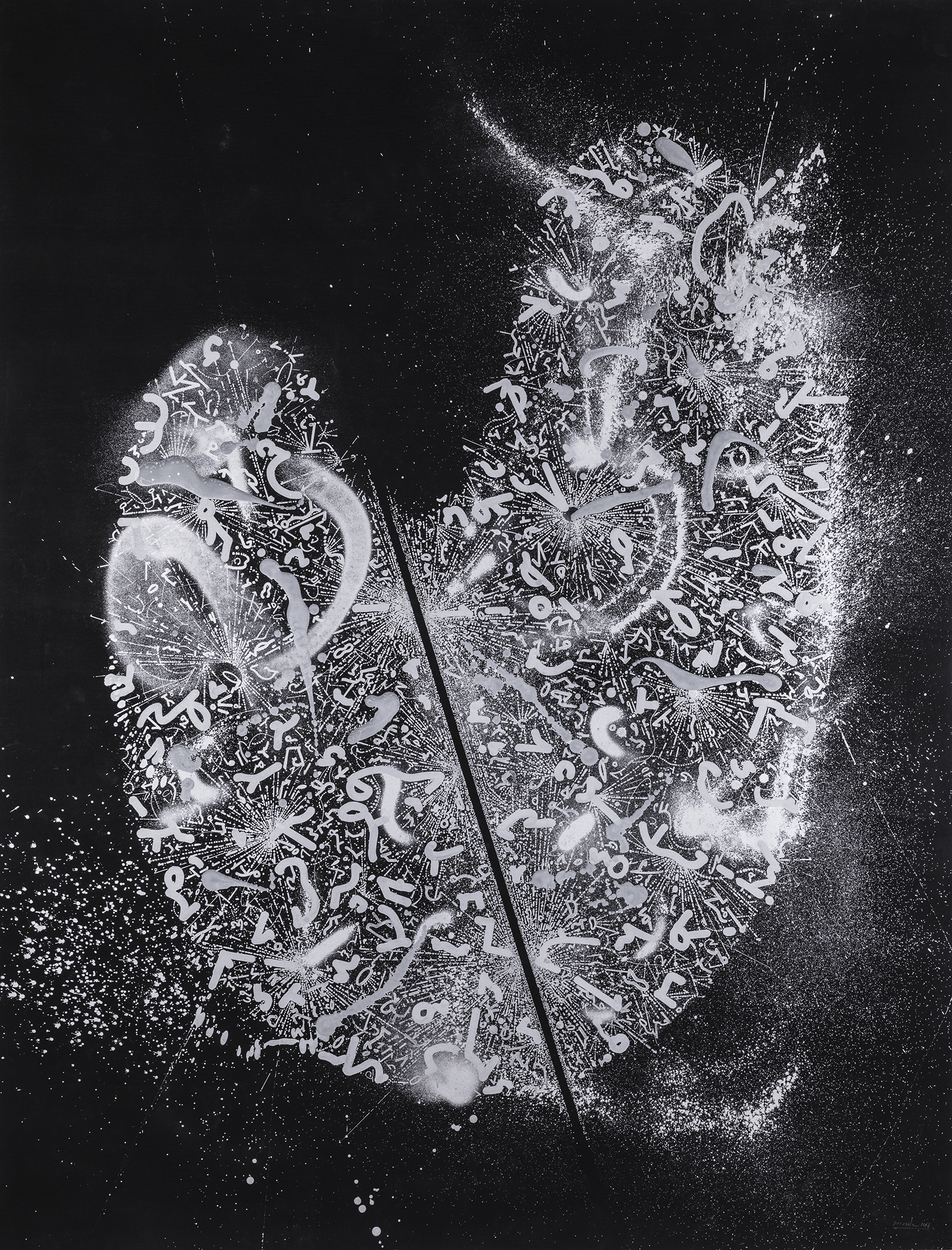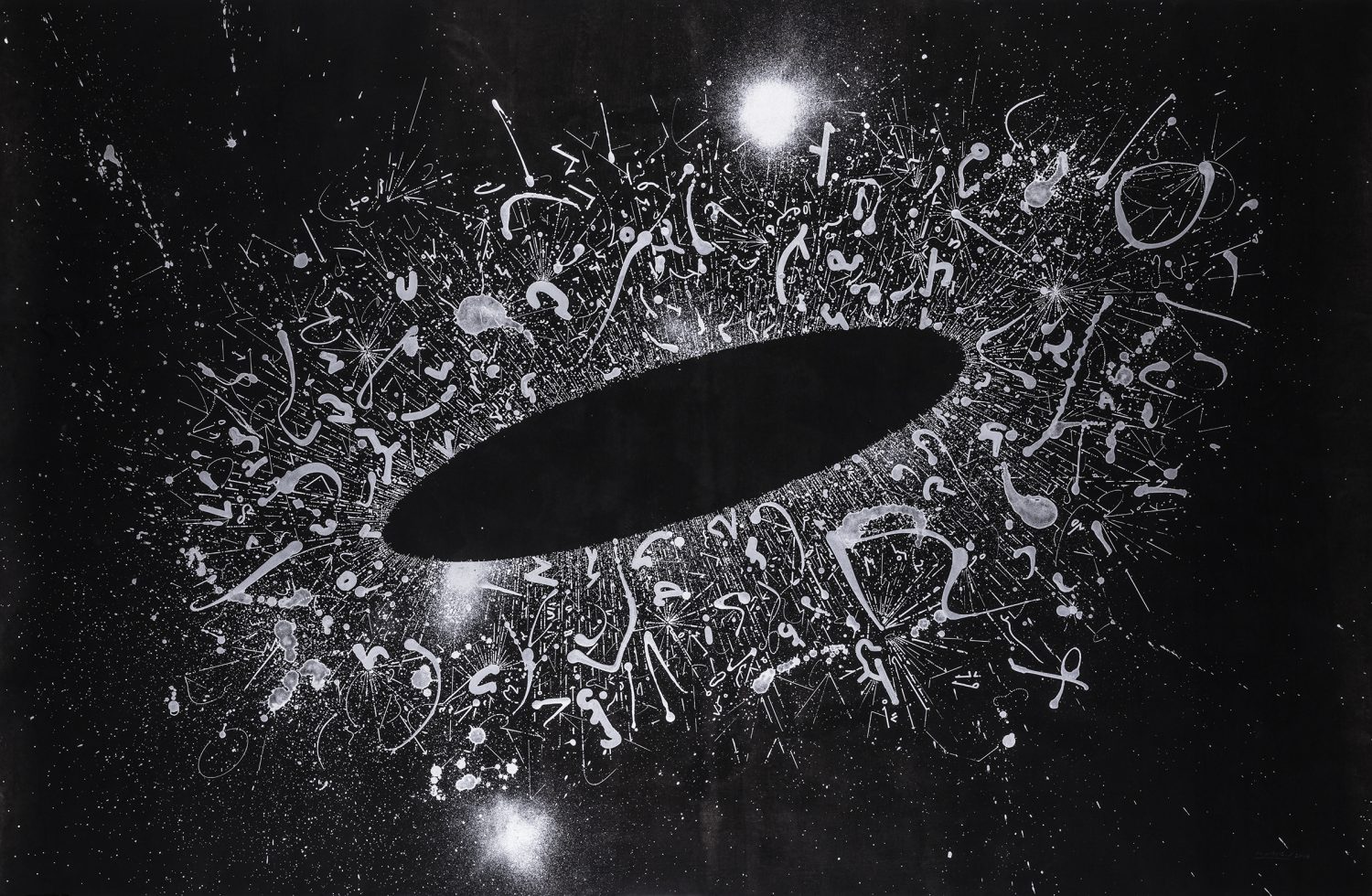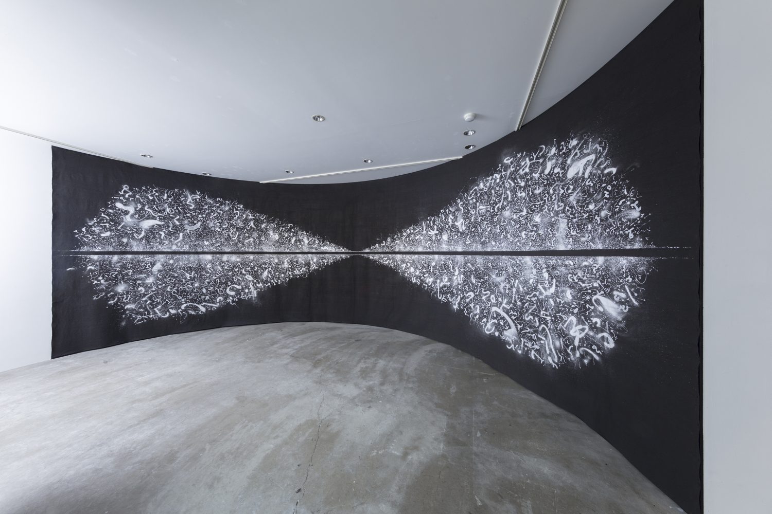 In producing these drawing works, the artist sprayed aggregations of dots in light reflective silver ink against backgrounds of obscure spaces created by dyeing both paper and canvas with Chinese ink and mud, and then proceeded to excavate signs that appeared to be hidden within it. These collections of improvised gestures, as if attempting to discover imaginary constellations in the exploration between intention and chance, the visual and textual, gradually came to form large signs reminiscent of galaxies. The works can be considered as evidence of trials to generate a new representation of “calligraphy” in a space-age in which light and shade are reversed.