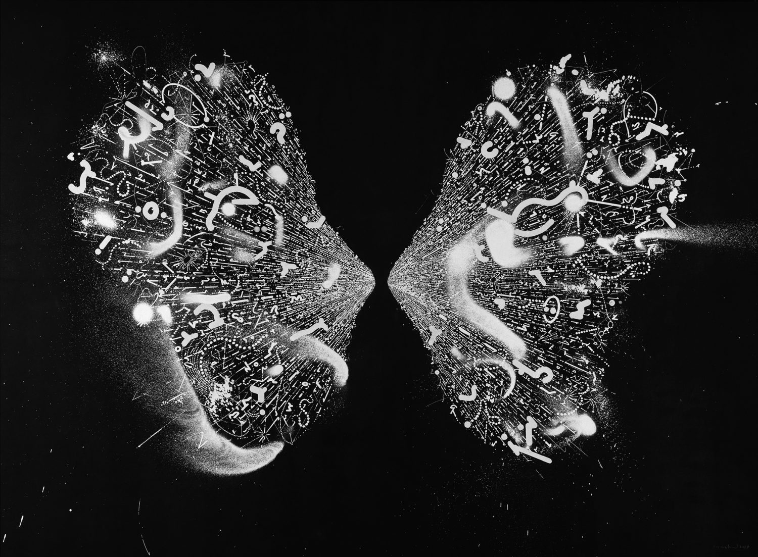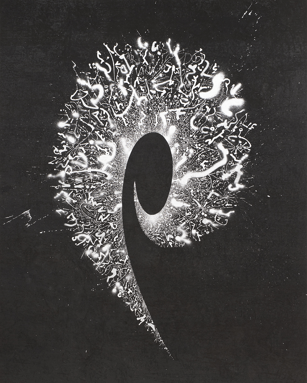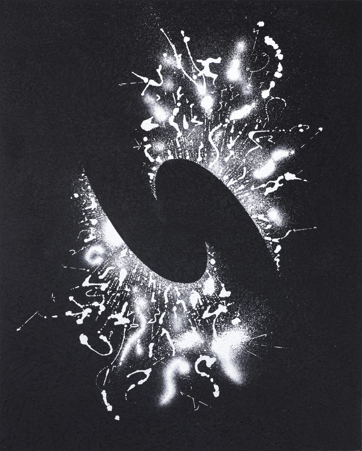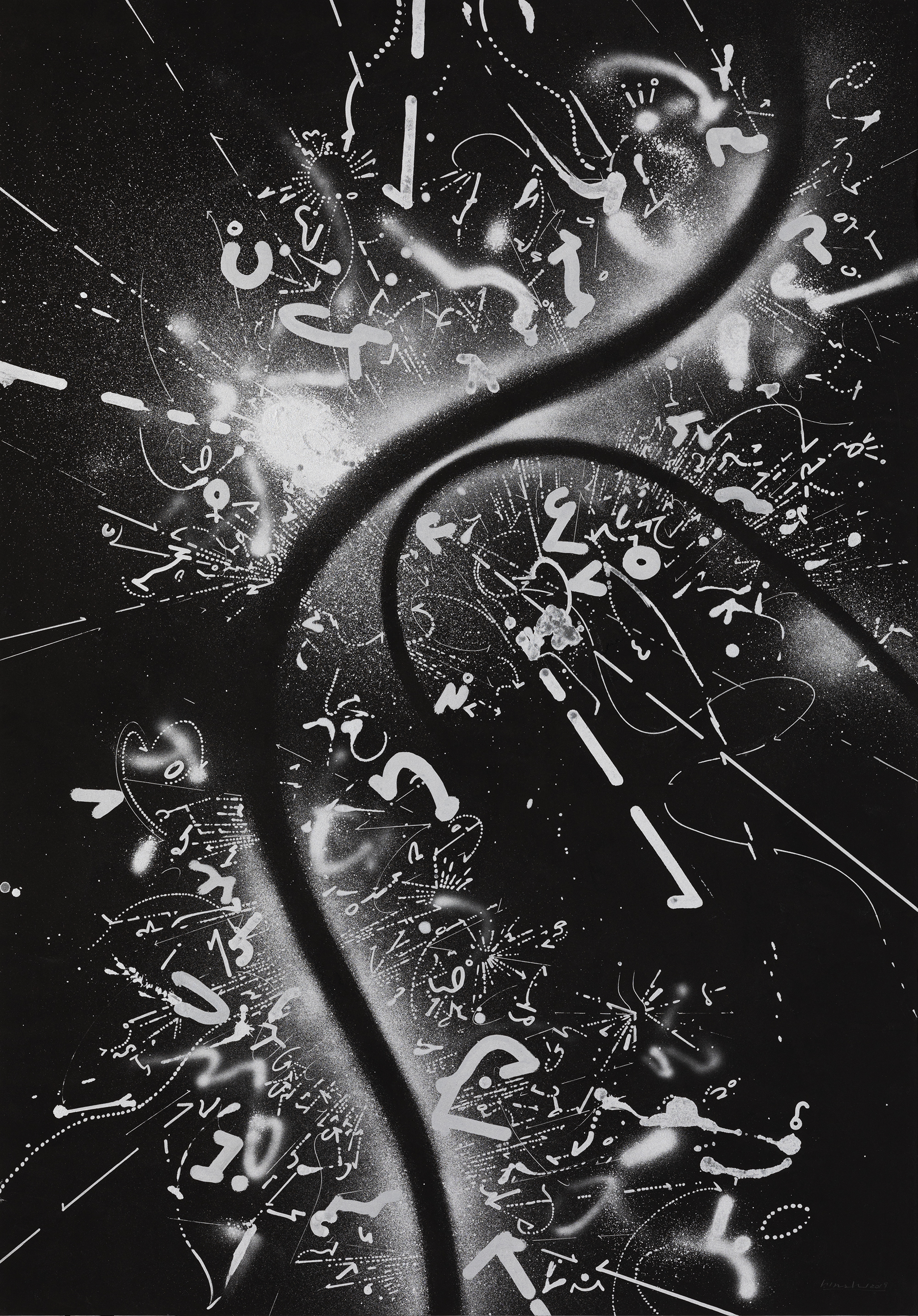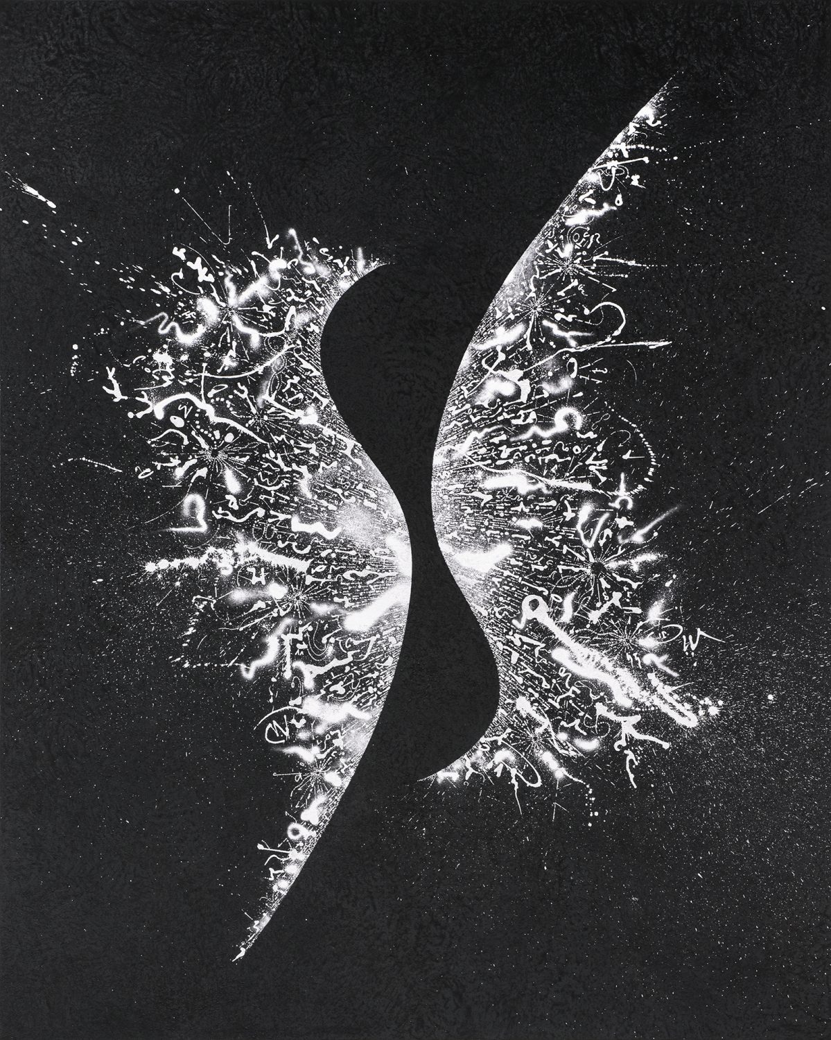 In producing these drawing works, the artist sprayed aggregations of dots in light reflective silver ink against backgrounds of obscure spaces created by dyeing both paper and canvas with Chinese ink and mud, and then proceeded to excavate signs that appeared to be hidden within it. These collections of improvised gestures, as if attempting to discover imaginary constellations in the exploration between intention and chance, the visual and textual, gradually came to form large signs reminiscent of galaxies. The works can be considered as evidence of trials to generate a new representation of “calligraphy” in a space-age in which light and shade are reversed.