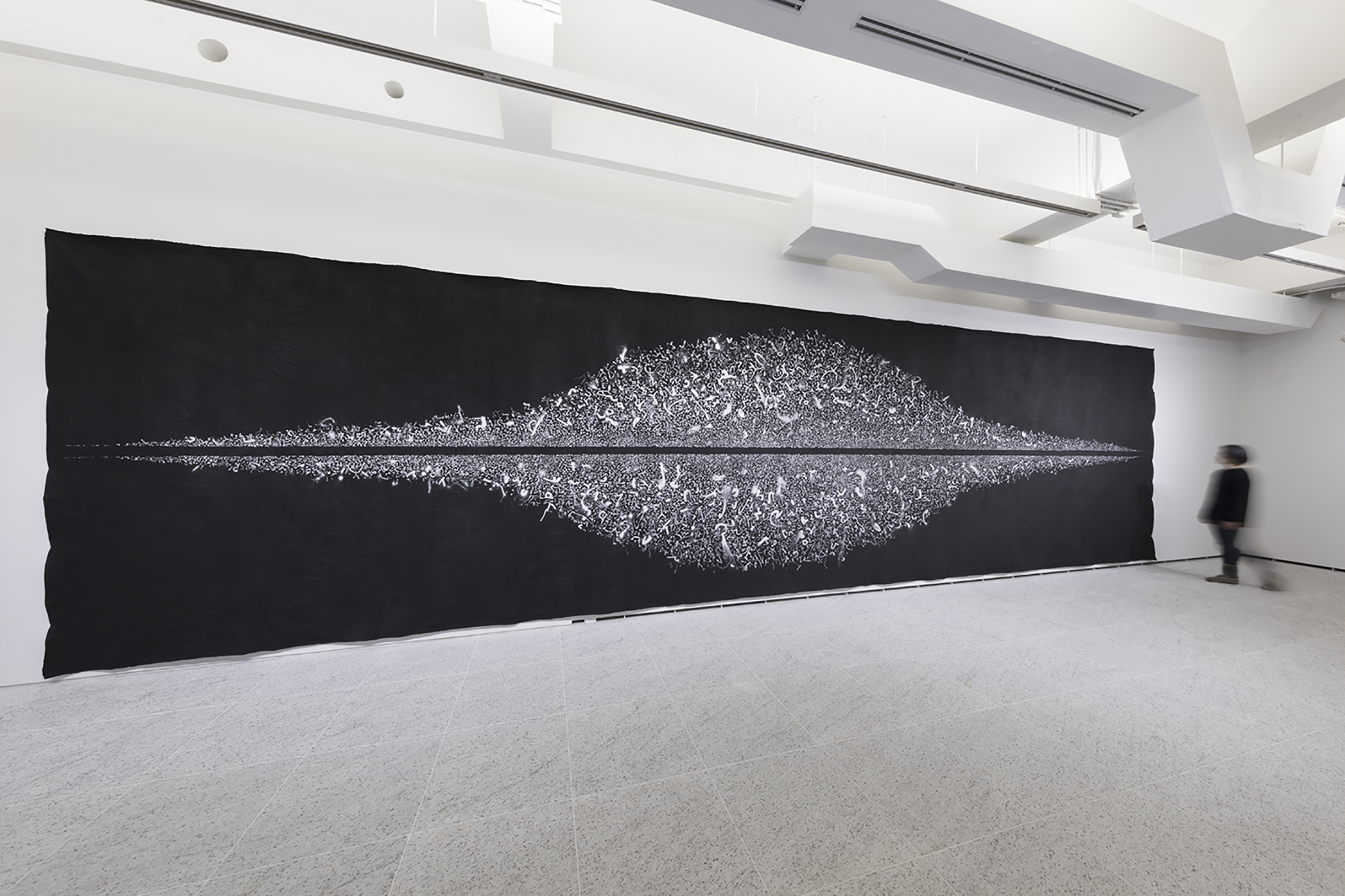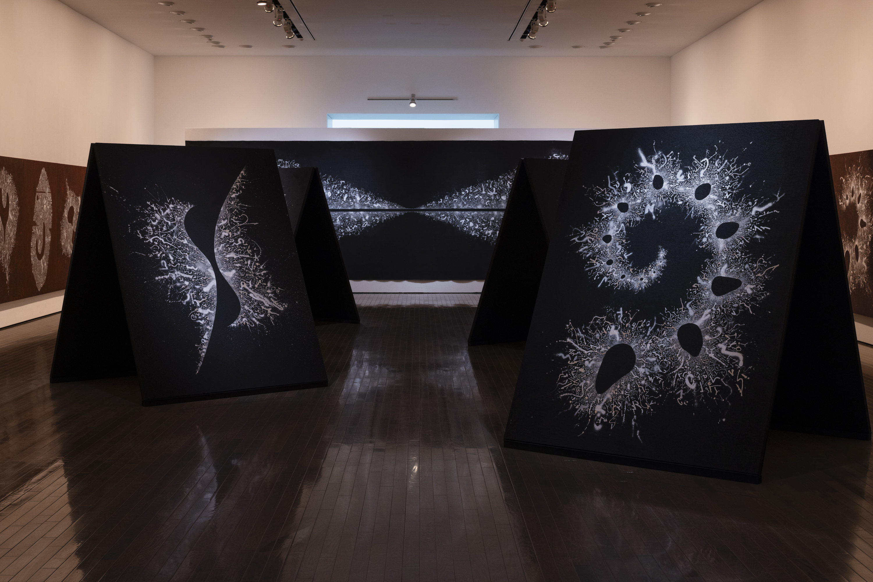 silver ink, earth, acrylic and Chinese ink on canvas, h2700 x w11000mm, installation view at Arts Maebashi (Gunma, Japan) 2017, photo by Ooki Jingu
