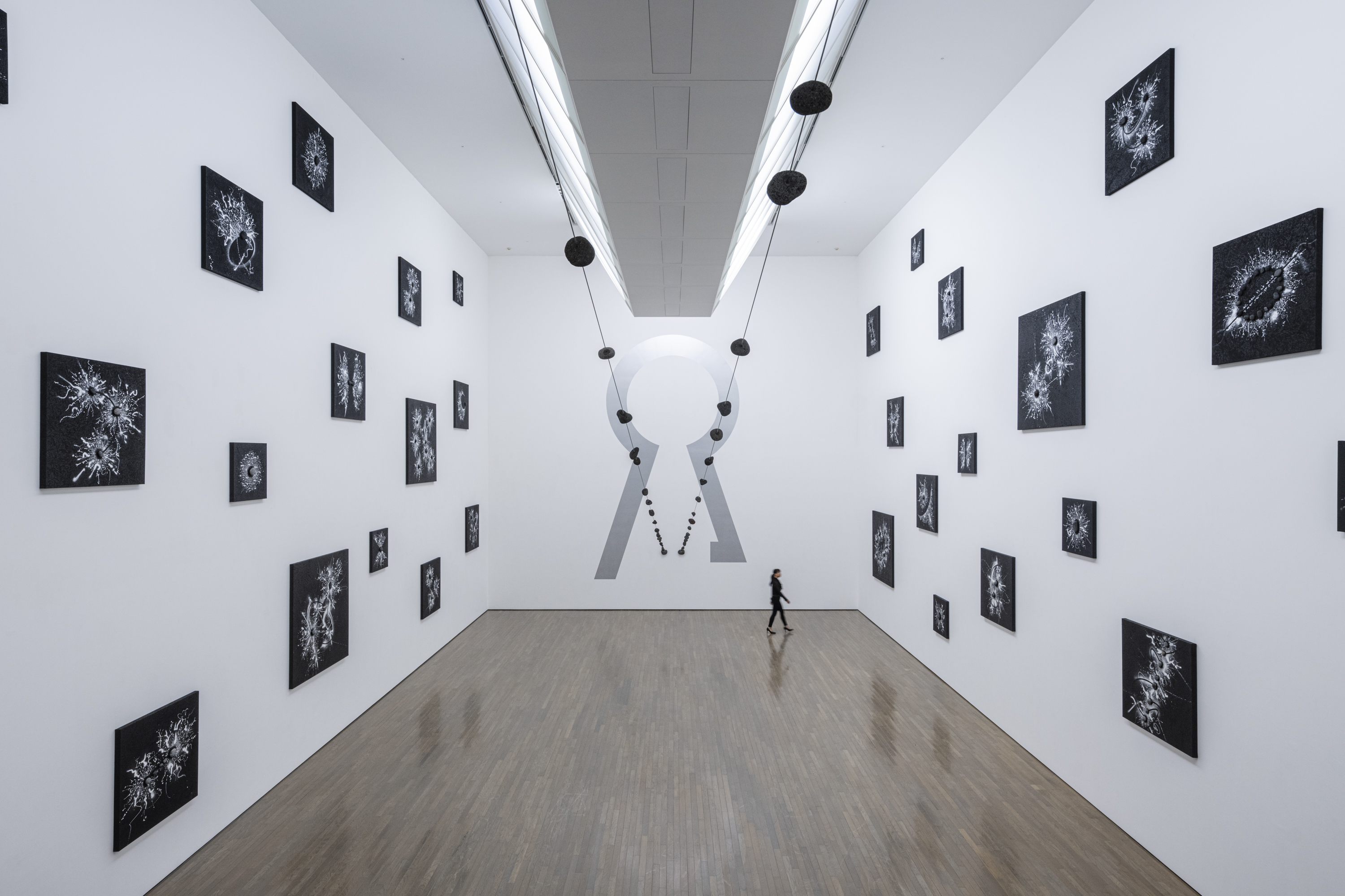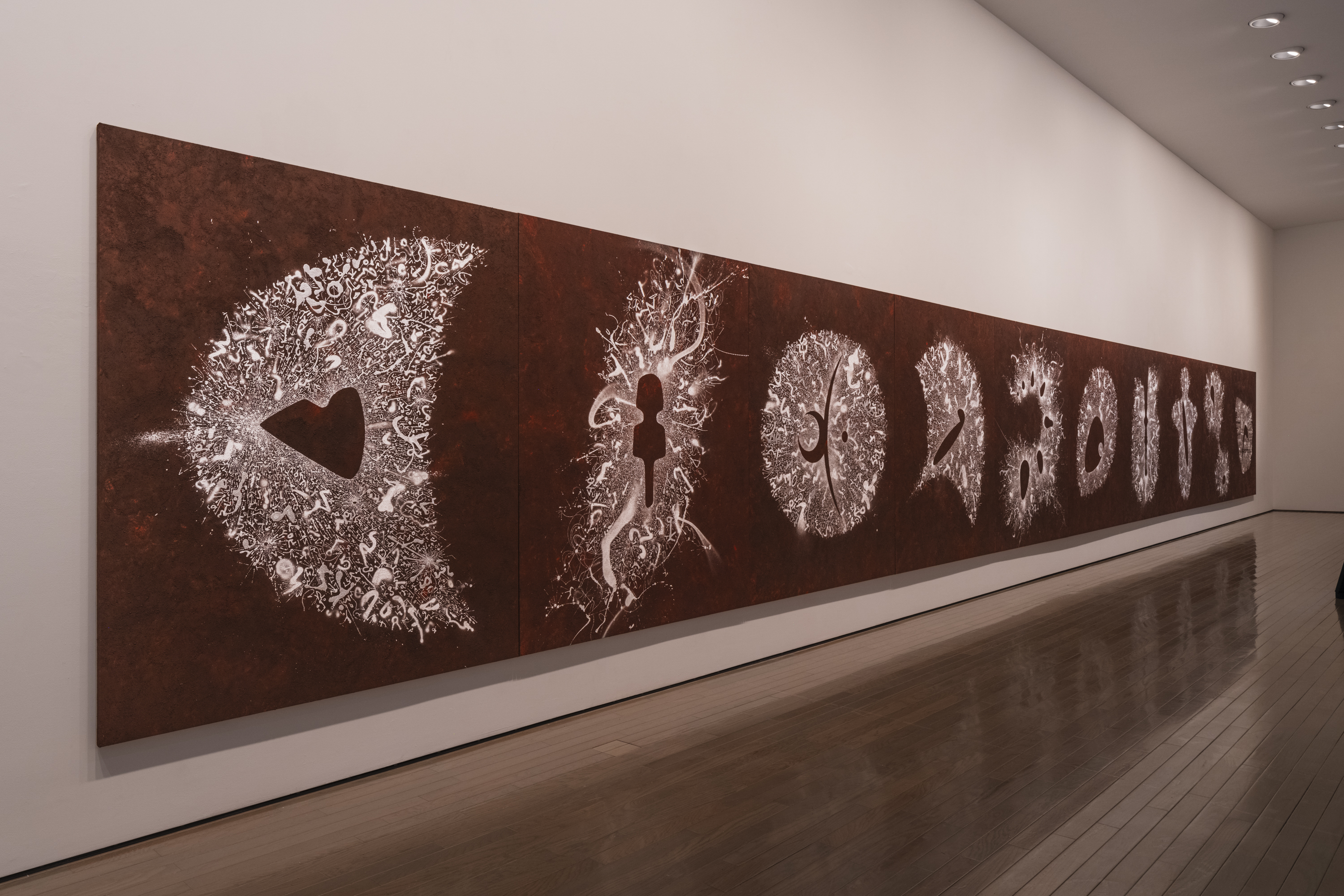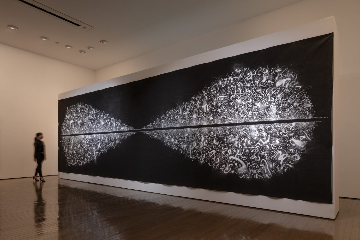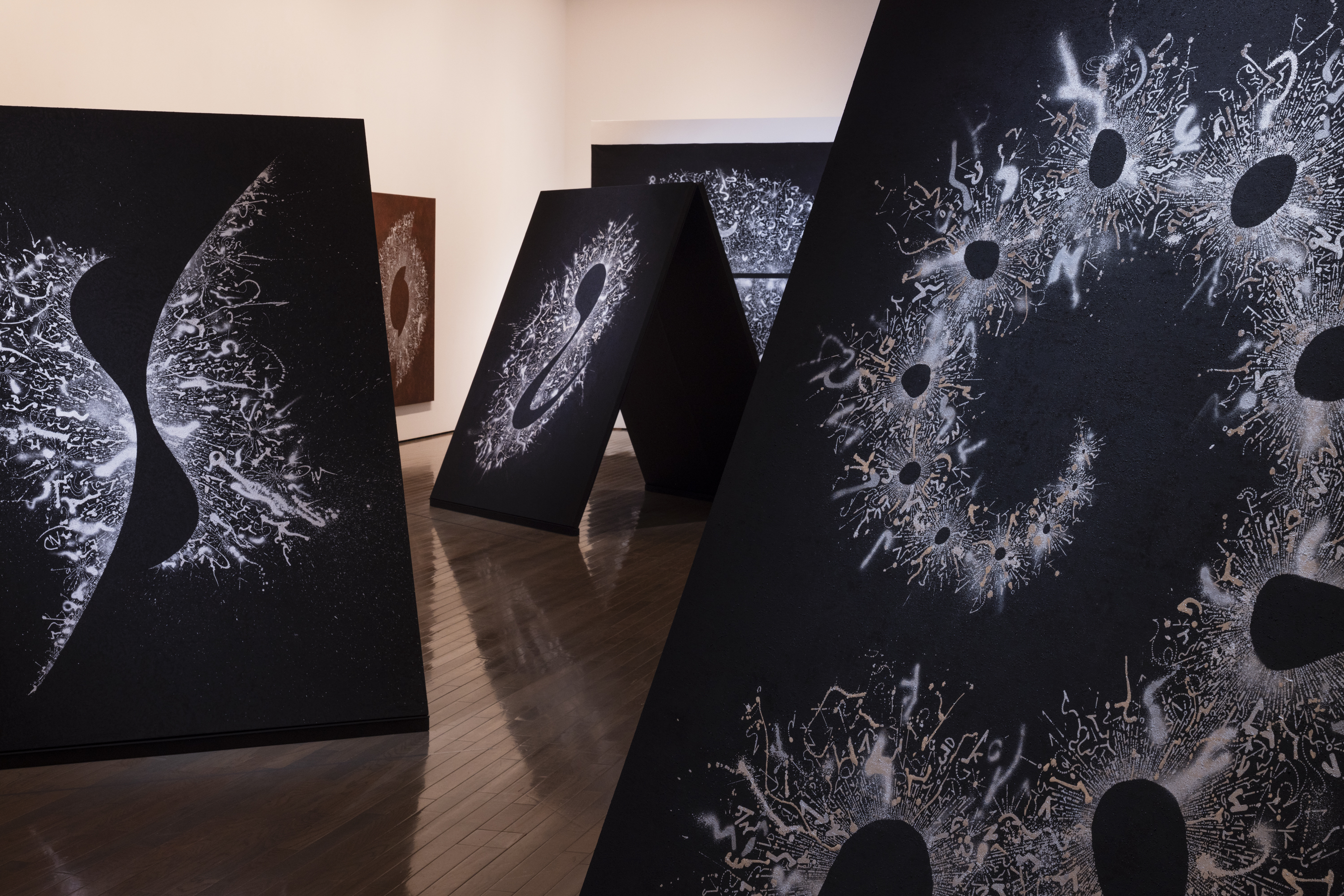 展示会場は、昨年末惜しくもこの世を去った建築家、磯崎新(1931–2022)設計による当館の現代美術棟(1997年竣工)です。磯崎は当館の建物を、作品が通り抜けていく空洞として構想しました。それと響き合うかのように、鈴木は展示室から展示室へ、描くこと/書くことの起源と未来を求めて、人類最古の壁画が残された洞窟から人知を超えて生成と消滅が繰り返される宇宙空間へと、線を連ねていきます。