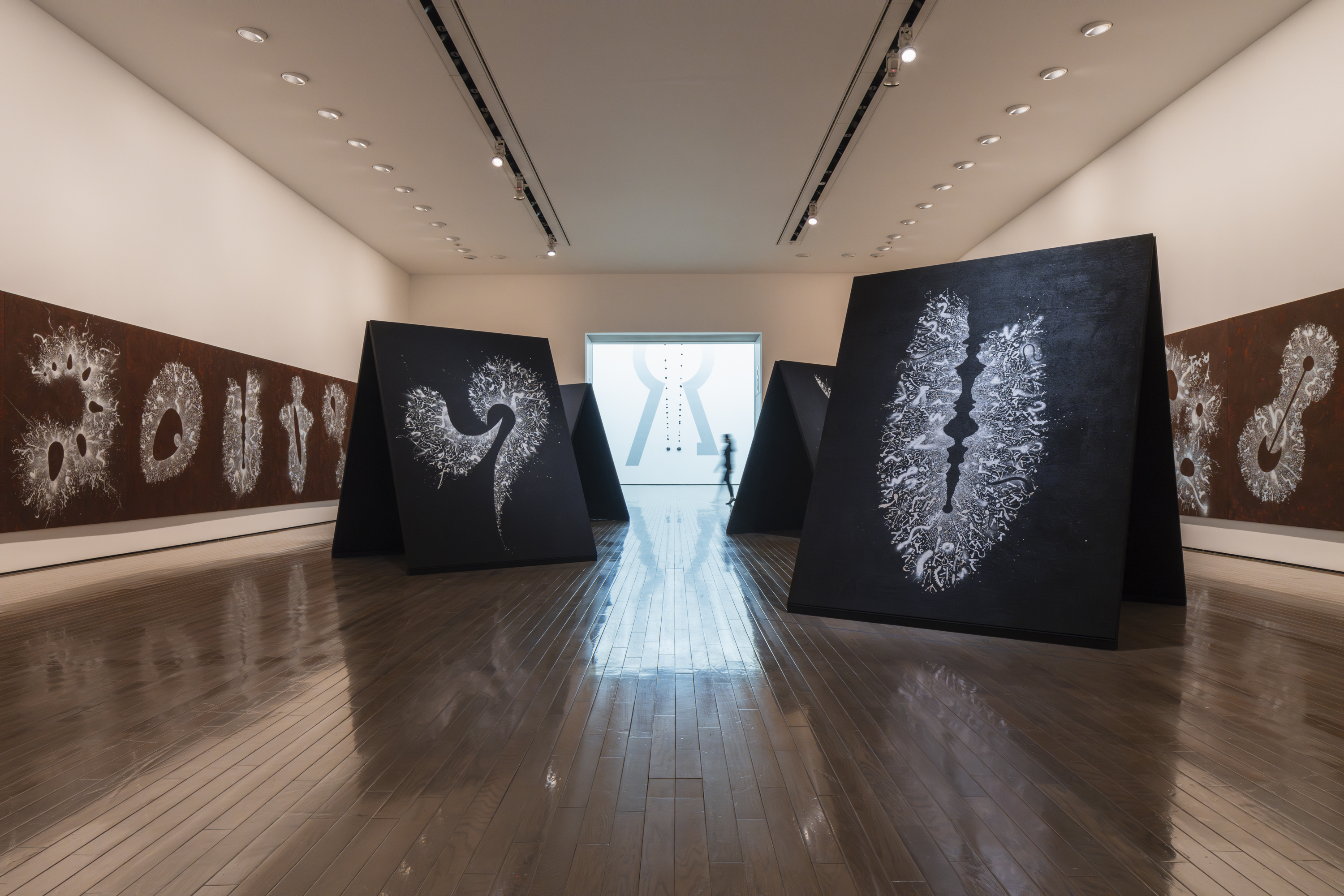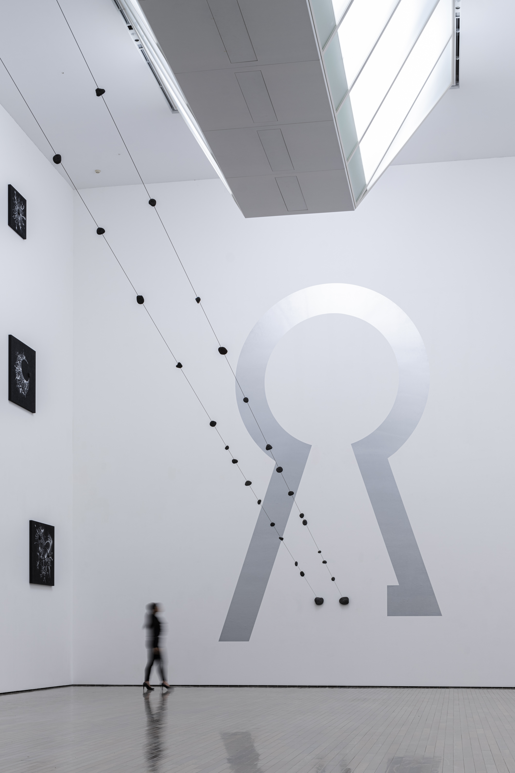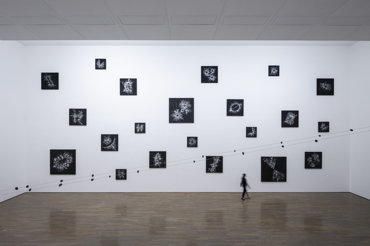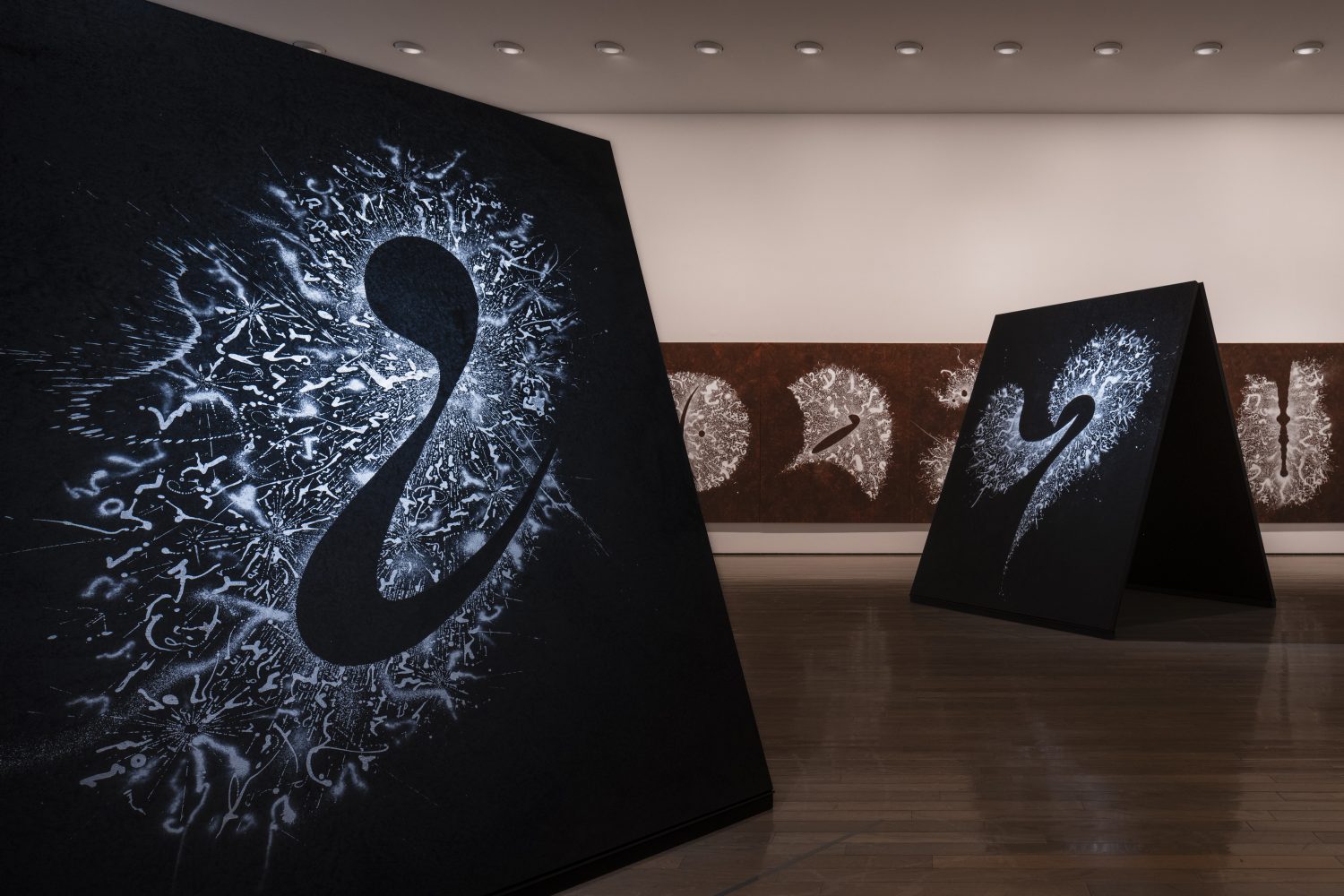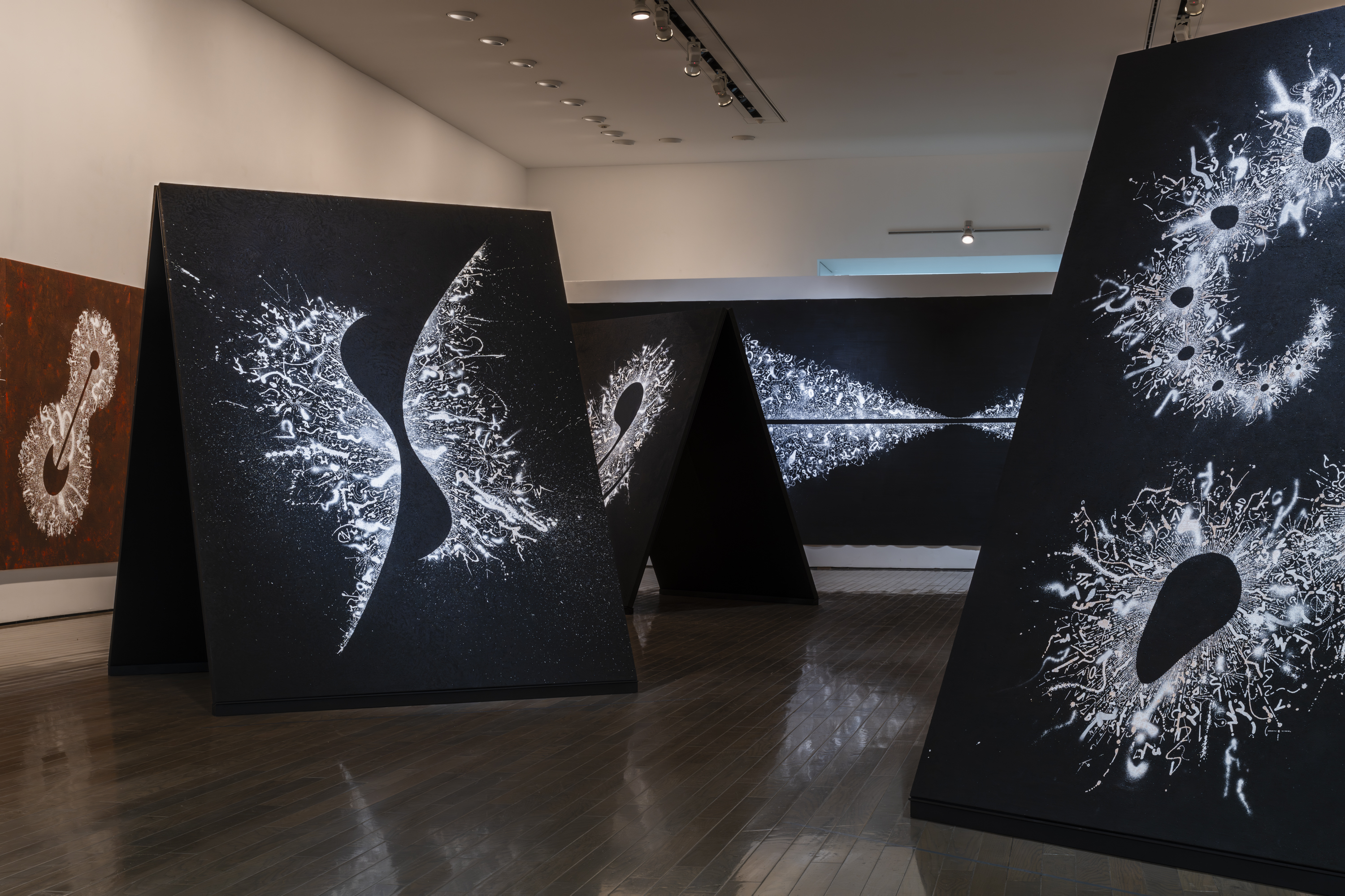 展示会場は、昨年末惜しくもこの世を去った建築家、磯崎新(1931–2022)設計による当館の現代美術棟(1997年竣工)です。磯崎は当館の建物を、作品が通り抜けていく空洞として構想しました。それと響き合うかのように、鈴木は展示室から展示室へ、描くこと/書くことの起源と未来を求めて、人類最古の壁画が残された洞窟から人知を超えて生成と消滅が繰り返される宇宙空間へと、線を連ねていきます。