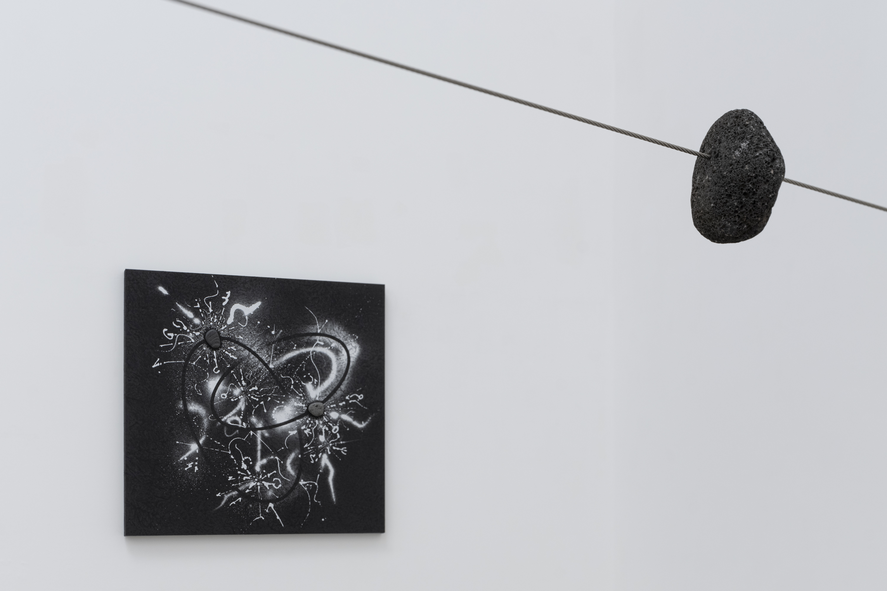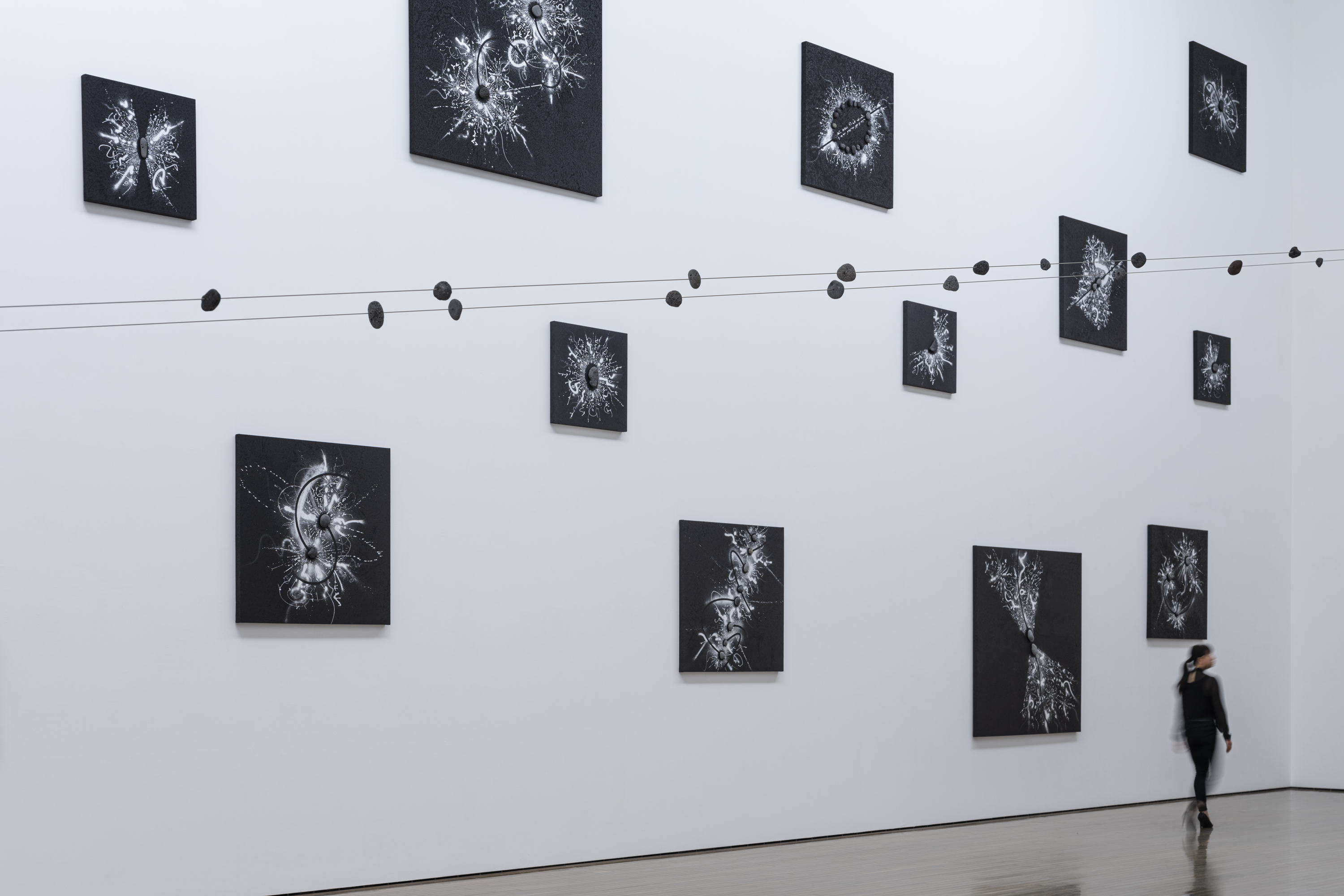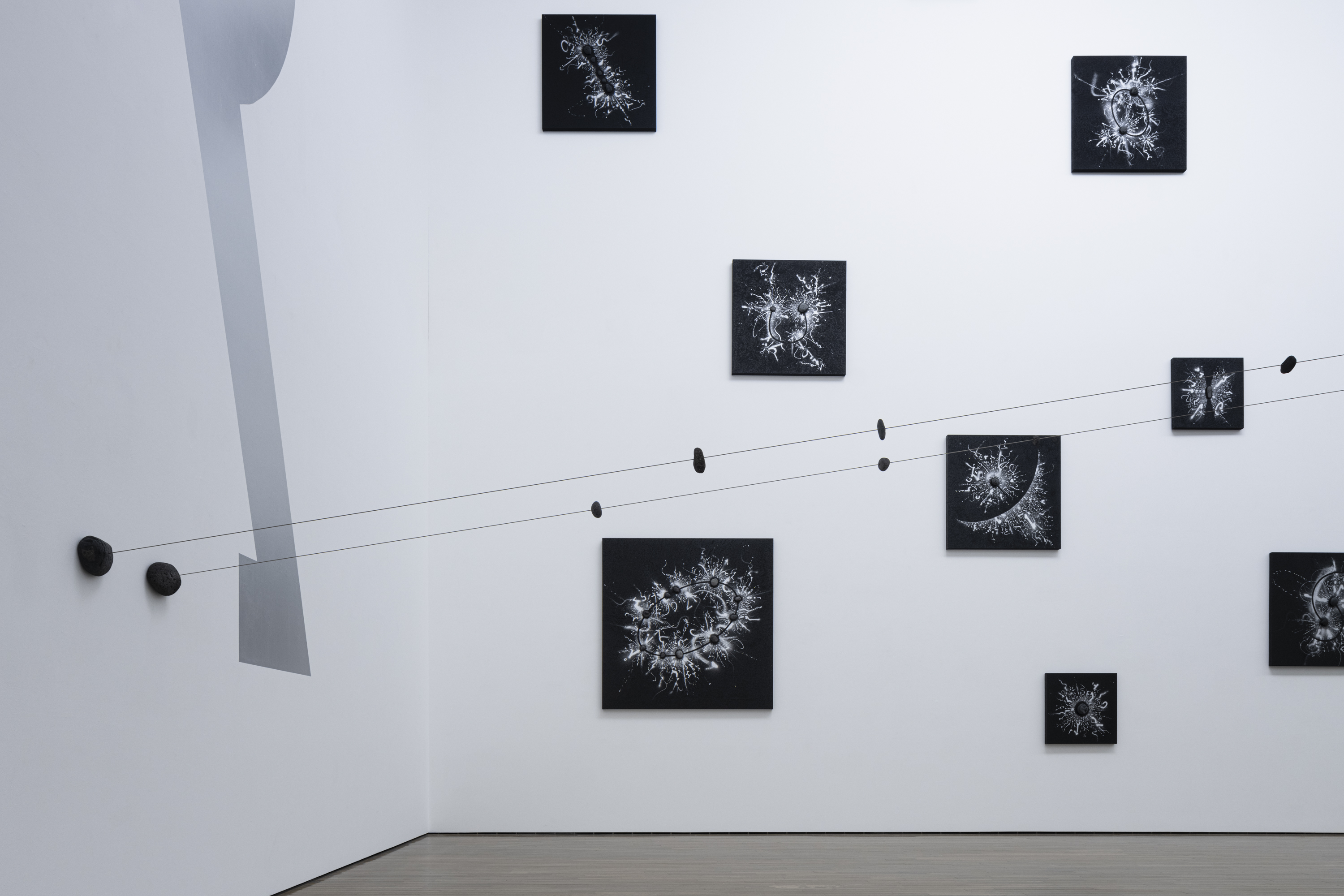 フランスの思想家ロジェ・カイヨワの著書『石が書く』(1970年)を参照したタイトルが示すとおり、〈隕石が書く〉は、宇宙空間を移動する石が反射する光の軌道など様々な記号を集積し、作家が身近な環境で拾った匿名の石が孕む膨大な情報と呼応しながら、人類史を遙かに超えた時間軸において生成され続ける線を新しい言語として画面に刻み込む試みです。
