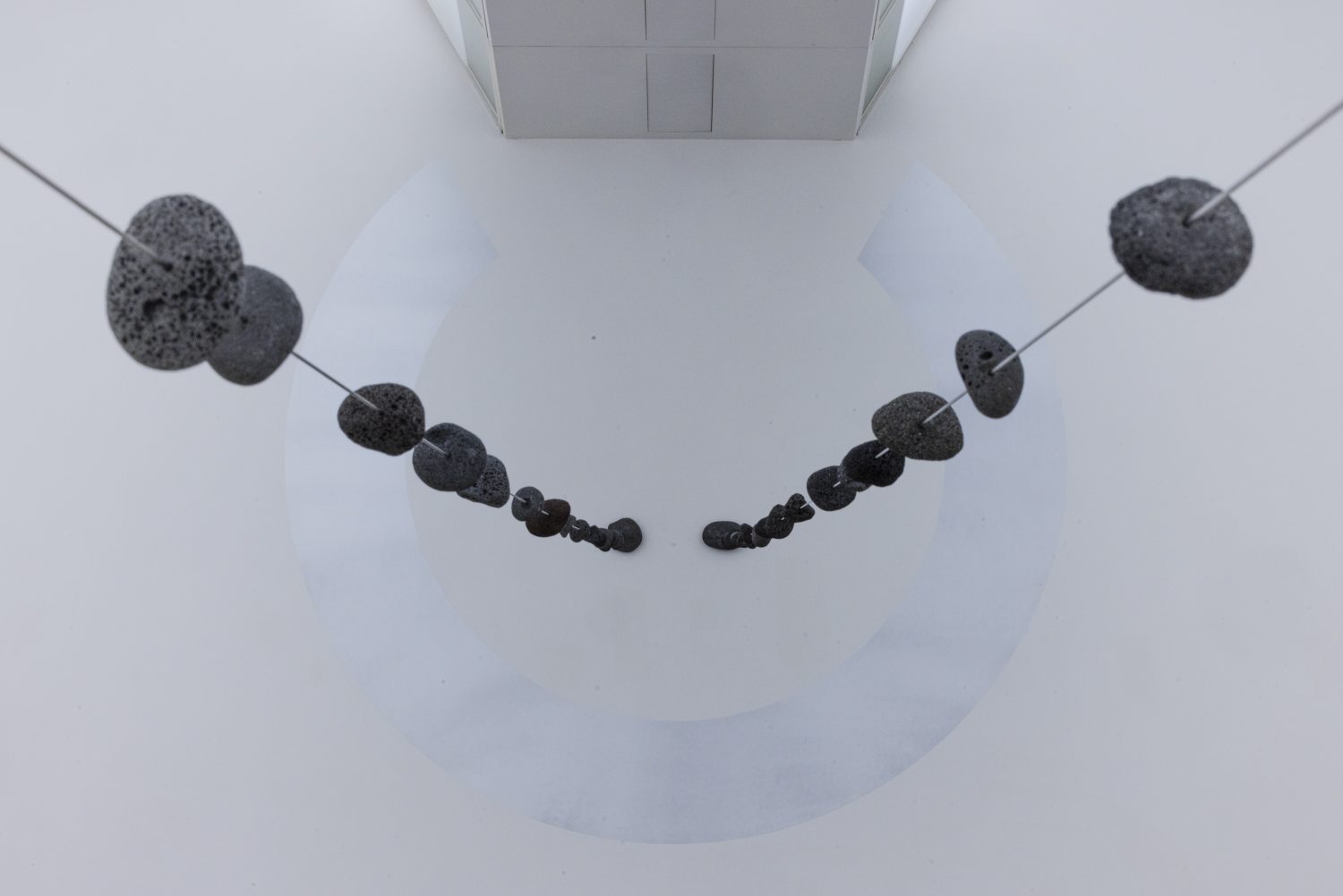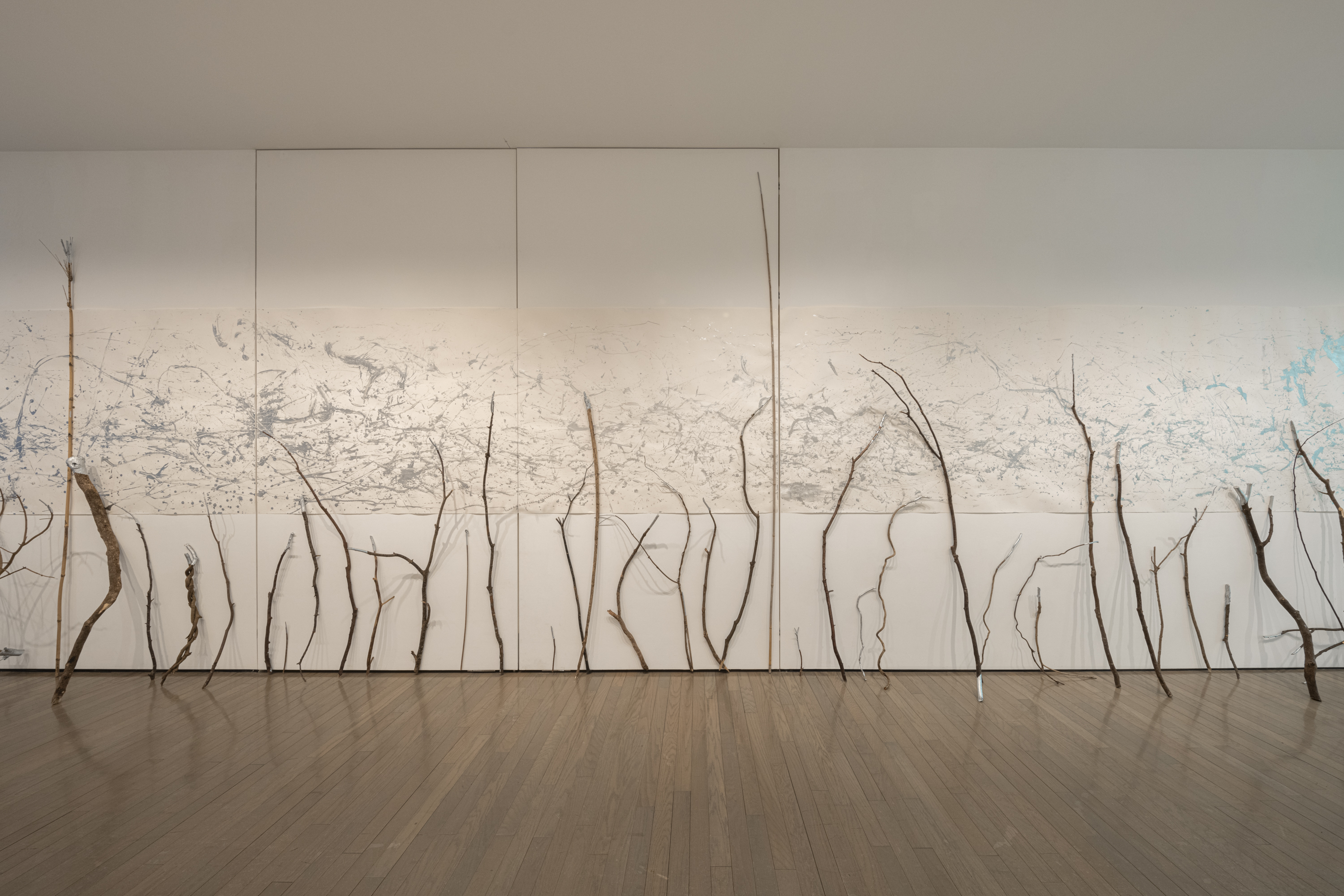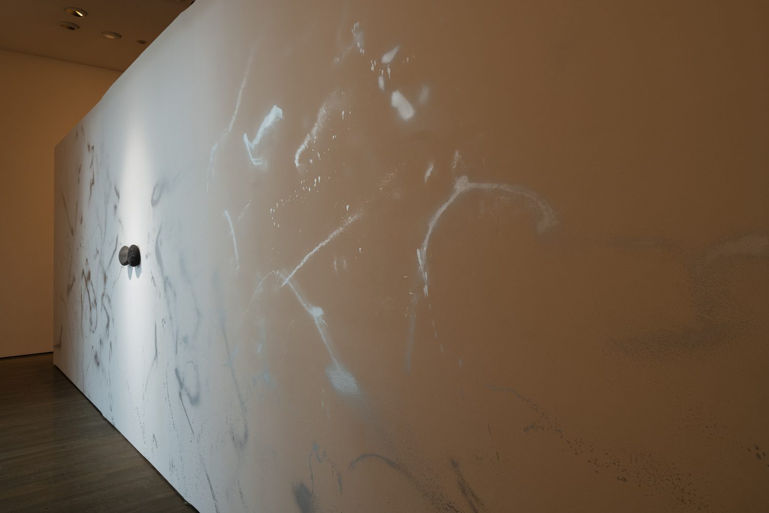 フランスの思想家ロジェ・カイヨワの著書『石が書く』(1970年)を参照したタイトルが示すとおり、〈隕石が書く〉は、宇宙空間を移動する石が反射する光の軌道など様々な記号を集積し、作家が身近な環境で拾った匿名の石が孕む膨大な情報と呼応しながら、人類史を遙かに超えた時間軸において生成され続ける線を新しい言語として画面に刻み込む試みです。