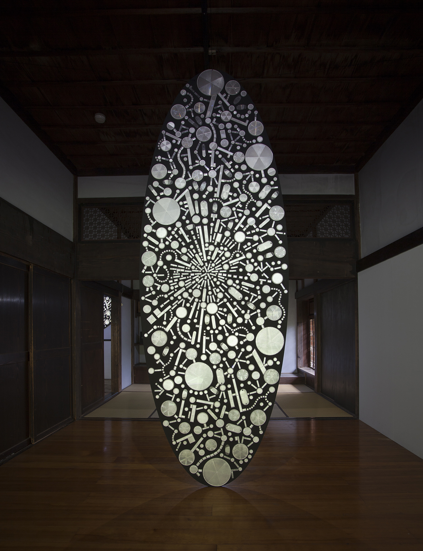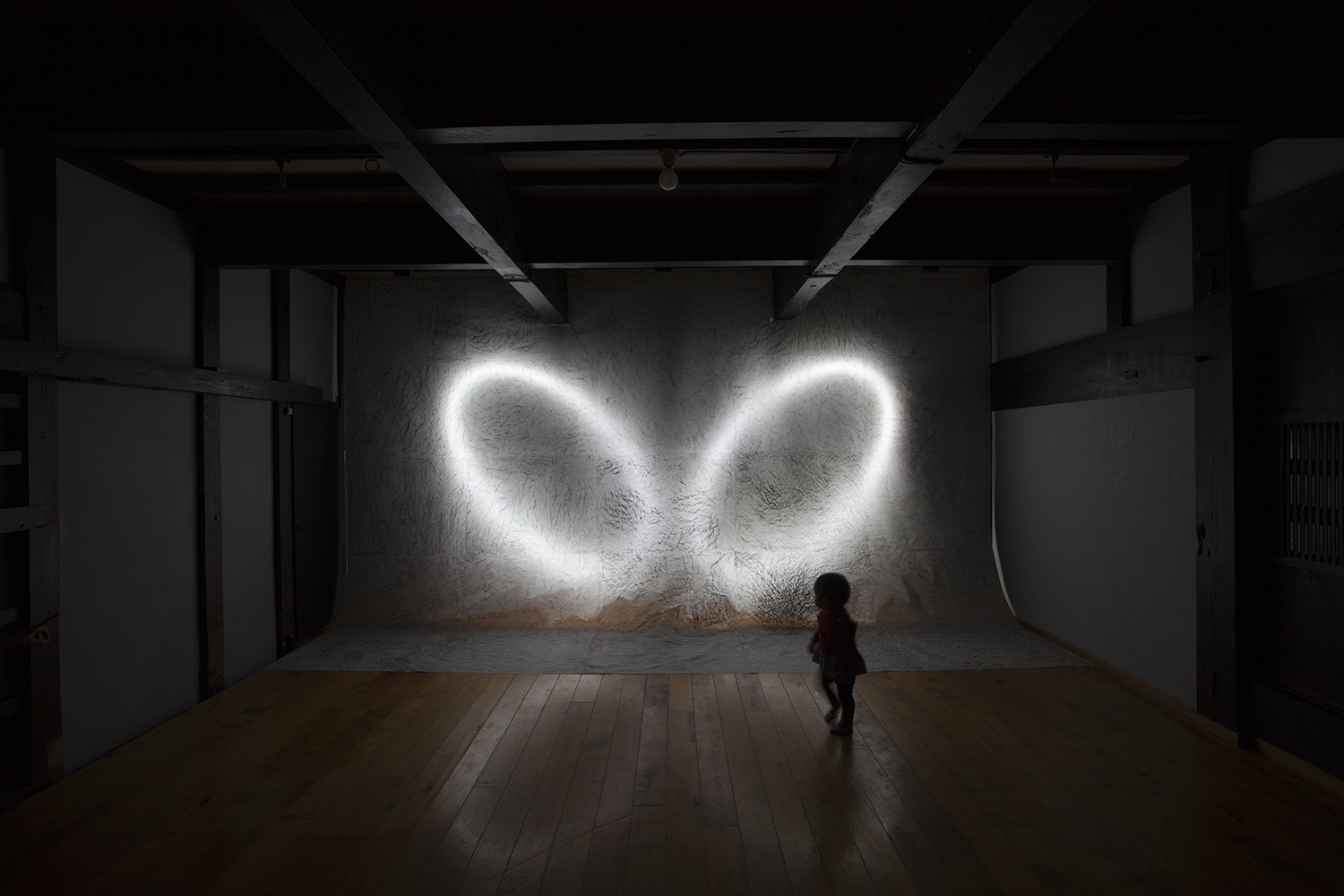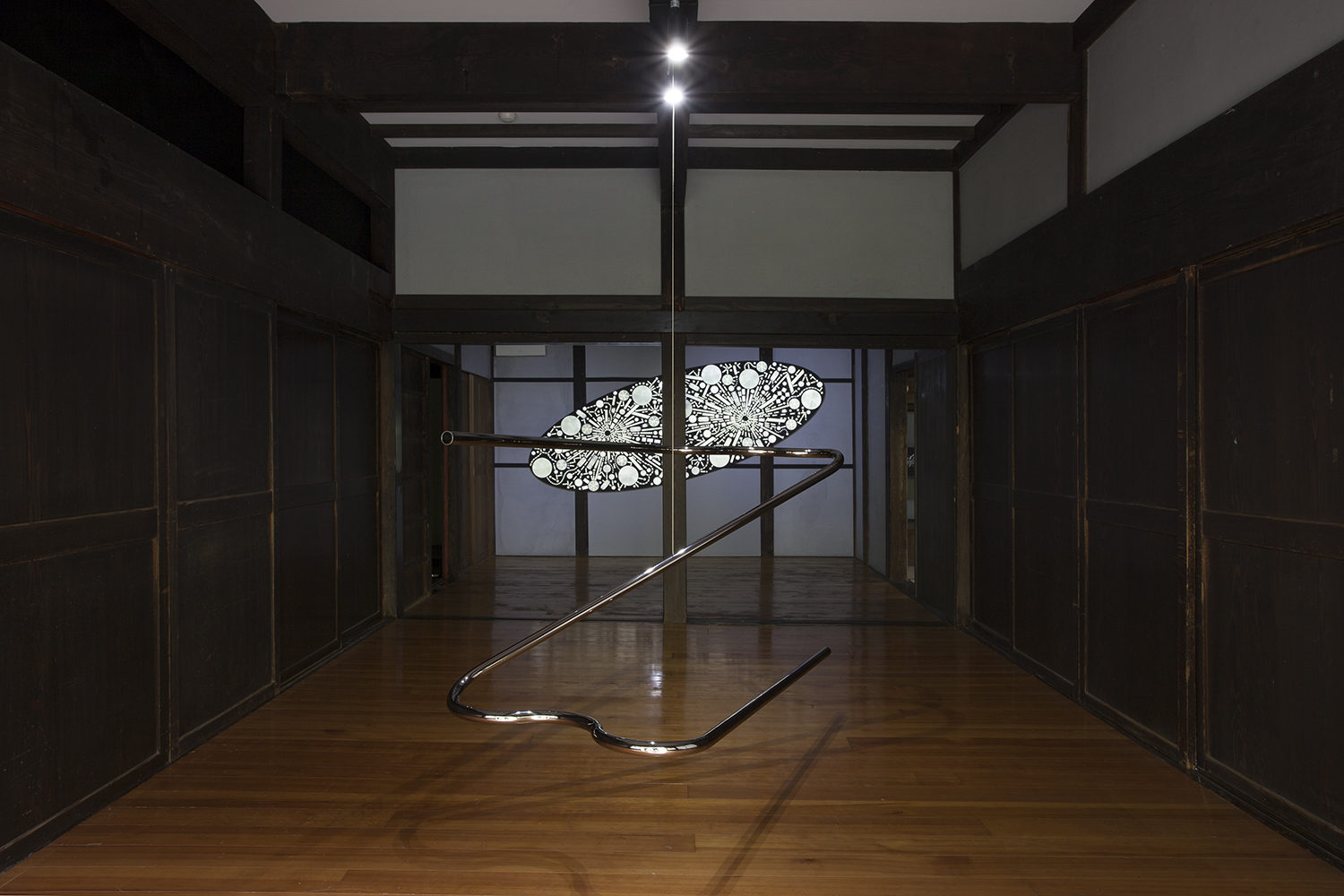 会場: アートハウスあそうばらの谷(千葉), 会期: 2017年4月8日 – 5月14日, 展示作品: Warp / Road (Entrance, Middle, Exit)/ Road (Gap)/ Drawing Tube / 軌道と記号 (#01-#03)/ GENGA #001-#1000 (video) / 流星の断面 / 永昌寺トンネル, 写真: 村上圭一