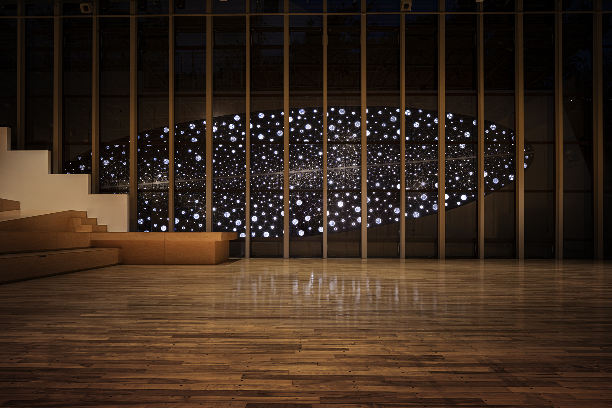 反射板、木製パネル, h1750 x w3600mm, 写真: 神宮巨樹